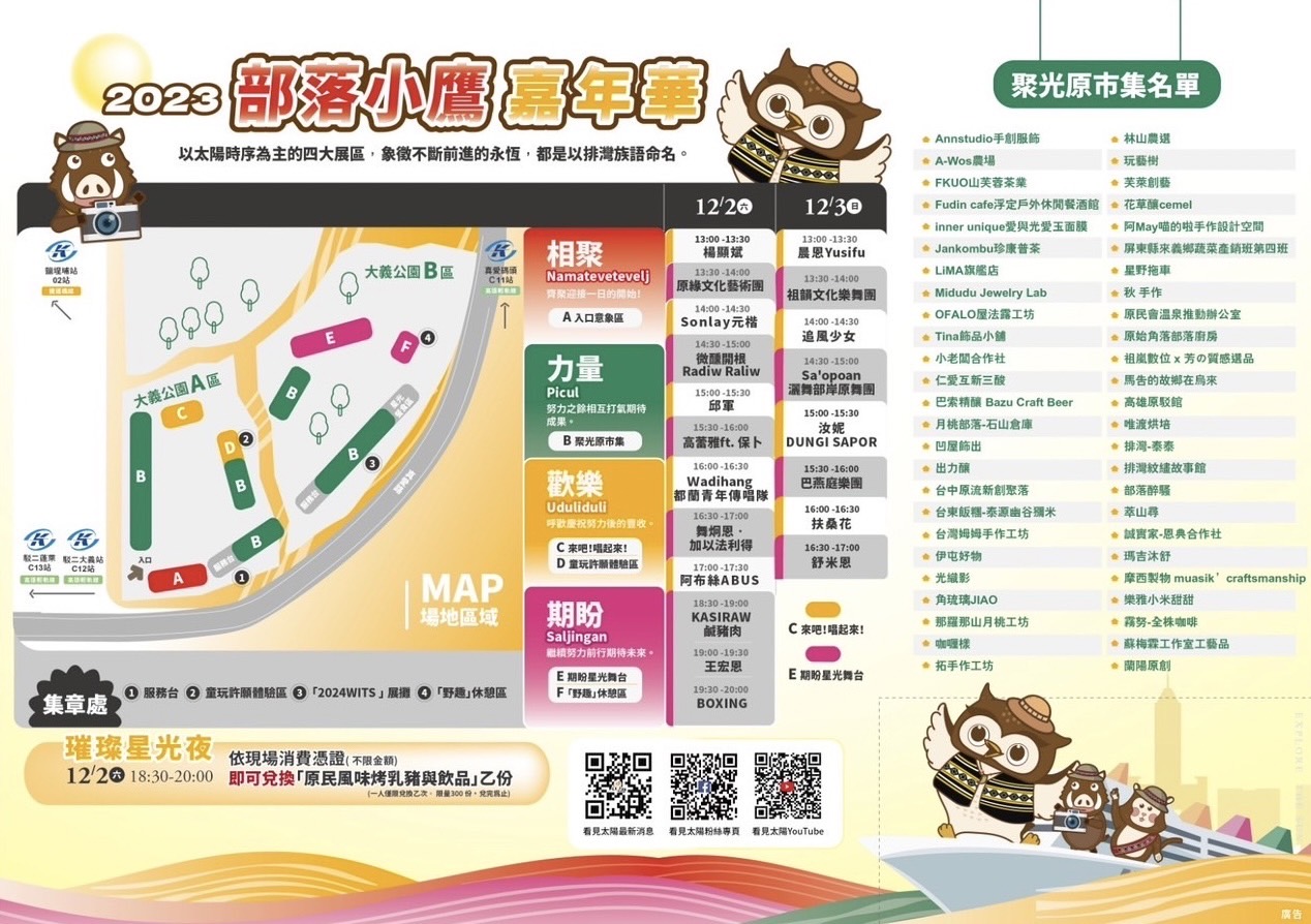 (12/2-3)在駁二藝術特區大義公園歡樂登場的「部落小鷹嘉年華」,除了有好吃又好逛的市集及排灣族童玩體驗,還有阿布絲、舒米恩、王宏恩、Boxing等20組原住民族歌手、樂團、舞團的精采表演,其中週六晚上的「璀璨星光夜」,可一邊聽著舞台的音樂,一邊享用烤乳豬及原住民族風味特色飲品。