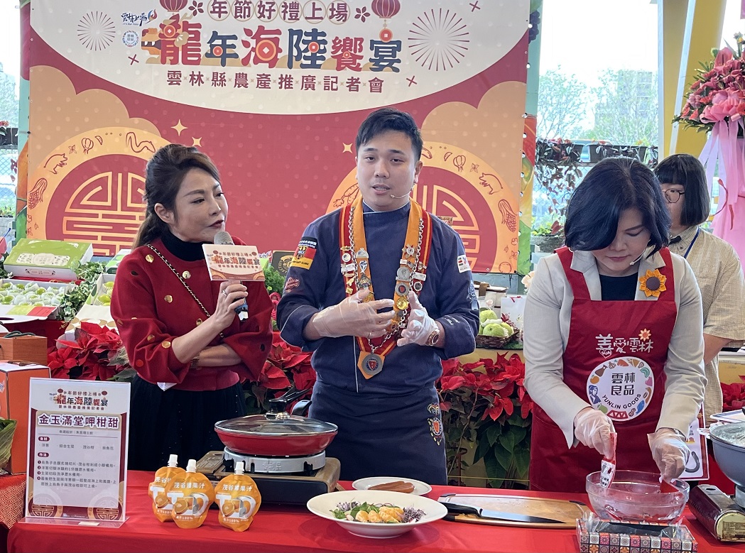 張縣長及金牌主廚朱昱瑋現場共同示範多道美味簡單料理,如結合口湖鰻魚和西螺好米烹調出最具年味的蒲燒鰻魚米糕、將象徵多金的烏魚子結合外型討喜茂谷柑做出的創意和風料理茂谷柑佐烏魚子等,現場更準備鰻魚米糕試吃活動,邀請民眾一同參與雲林龍年海陸饗宴,搶鮮過好年。