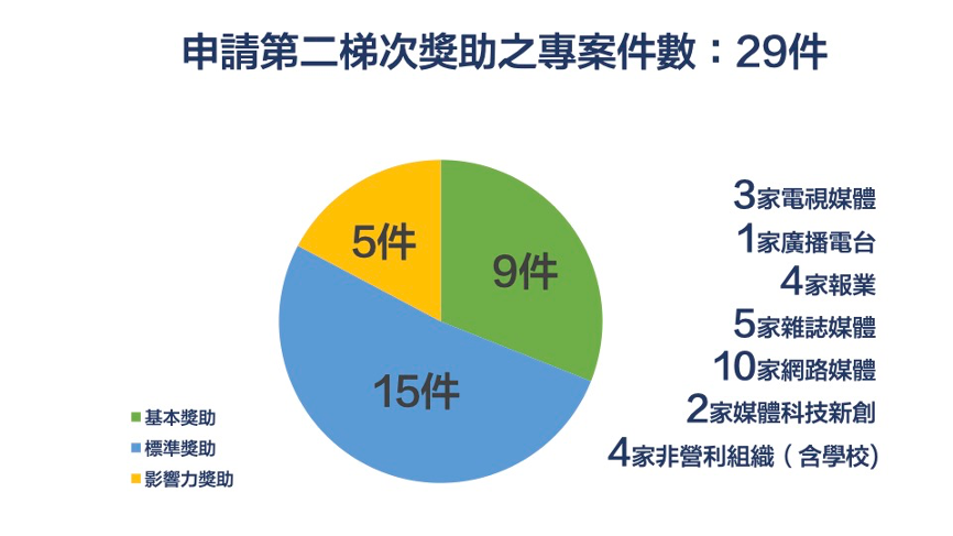 本梯次 (第一年度第二梯次)徵案活動中,DTA共收到29件完整申請,涵蓋電視、電台、報紙、雜誌出版、網路媒體、非營利組織,以及媒體行銷科技等媒體型態。(統計資料/DTA提供);徵案啟動時,DTA計畫管理團隊特別舉辦專案計畫書撰寫工作坊,並邀請第一梯次獲獎助單位包括親子天下及報導者進行經驗分享,亦提供超過30場的1對1諮詢場次,協助申請單位掌握獎助宗旨與精神,評選委員團皆表示,此梯次的計畫書品質明顯提升外,申請的獎助類別亦較適合。
