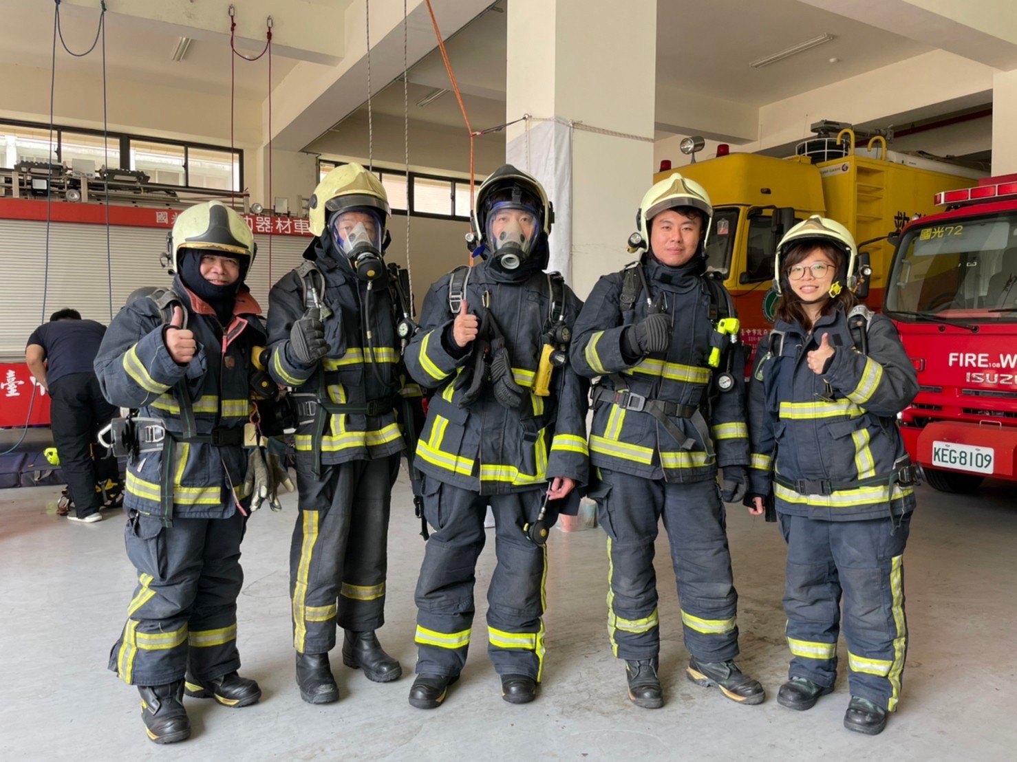 ▲消防衣著裝及空氣呼吸器介紹與實做。(台中市政府消防局提供)