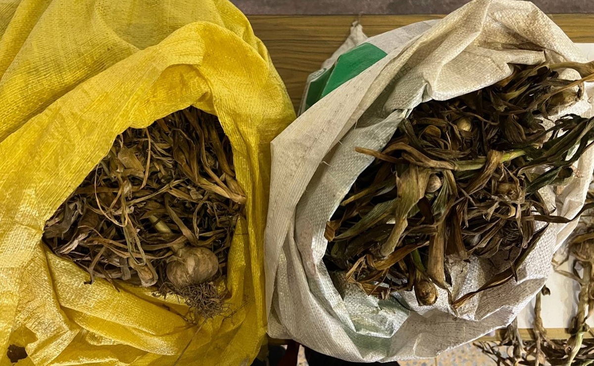 警方在尾隨一名騎腳踏車的男子時,發現他載有兩袋疑似失竊蒜頭的物品。(記者蘇峰毅攝)