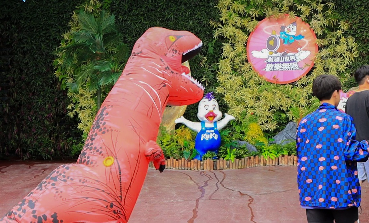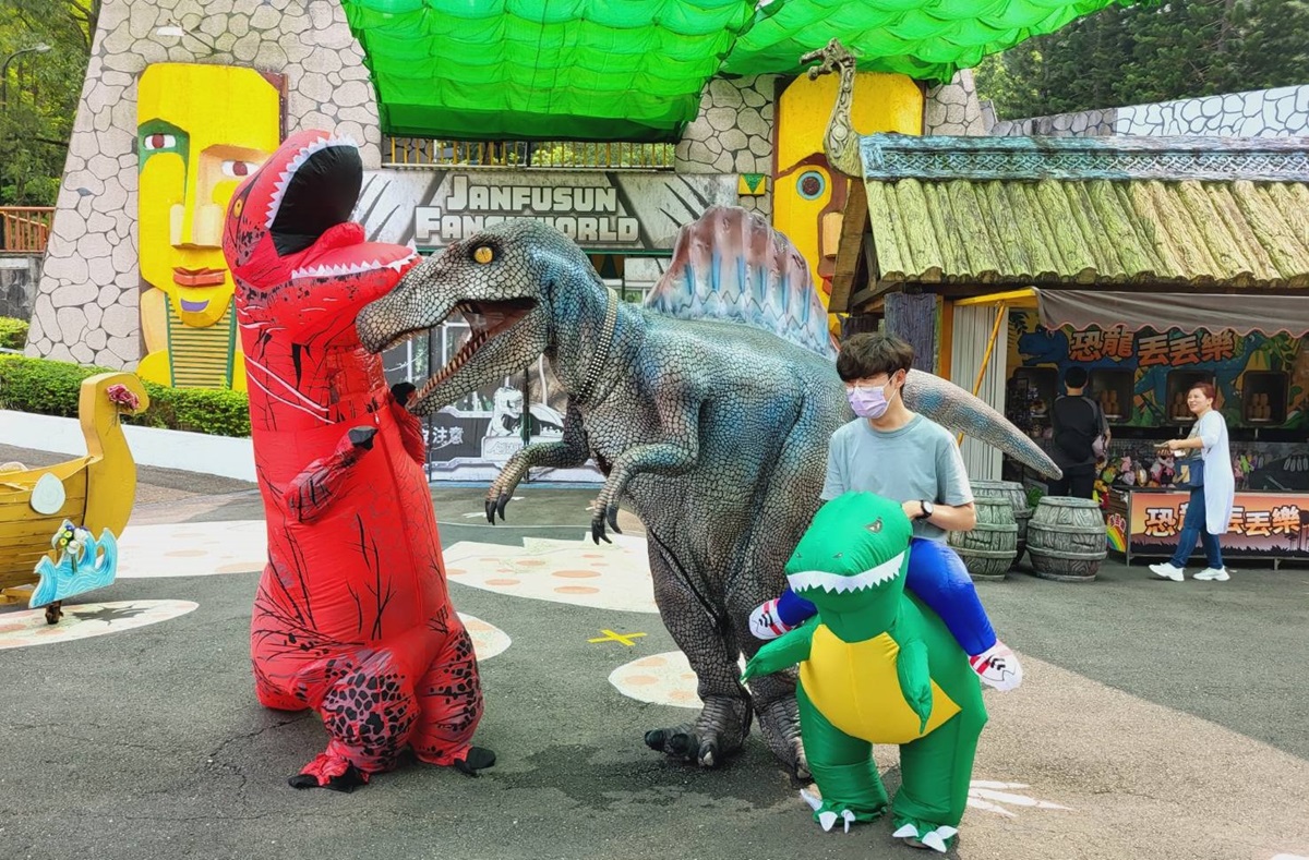穿著全身充氣恐龍裝或衣服、褲子上有恐龍圖樣到劍湖山世界,門票4折起。