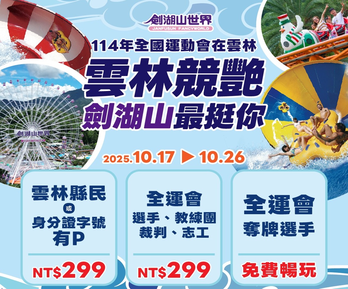 【記者蘇峯毅/雲林報導】114年全國運動會在雲林縣盛大舉辦,地方企業熱情響應。劍湖山世界主題樂園特別推出「雲林競艷 劍湖山最挺你」活動,自10月17日至10月26日期間,邀請全運選手、教練、裁判、志工及雲林縣民共享優惠。凡身分證字號含有「P」者,或出示相關證明文件者,皆可享入園票價每人299元的超值優惠。奪牌選手更可憑獎牌免費入園,為全運英雄喝采。