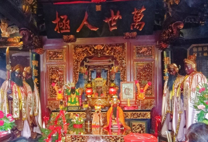 主殿中間是關公神像及神龕,清咸豐皇帝御筆「萬世人極」匾額高懸於上,意為關帝的品格,是千秋萬世為人的準則,這是對關帝最高的評價。牌匾下奉著兩尊關帝神像,前面一尊稱「鎮廟神」,是按「三國演義」中,關公的形象雕成,面如重棗,眉似臥蠶,紅顏長,氣宇軒昂,令人肅然起敬。