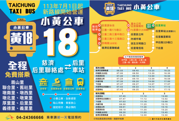 交通局提醒,7月1日起黃18路各班次發車時間配合路線調整,請民眾多加留意調整資訊,可至台中市政府交通局網站 ( https://www.traffic.taichung.gov.tw/content/index.asp?Parser=1,7,505,52 )、台中市公車即時動態資訊( https://citybus.taichung.gov.tw/ )或行動裝置「台中公車」APP查詢台中市小黃公車資訊。每輛小黃公車僅能載3到4人,建議於乘車前一天電話預約,預約人數較多車隊也會多安排車輛提供載客服務,黃18路預約電話(04)2436-6666 (怡美車隊)。