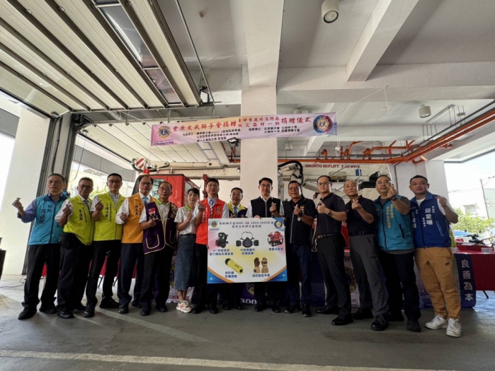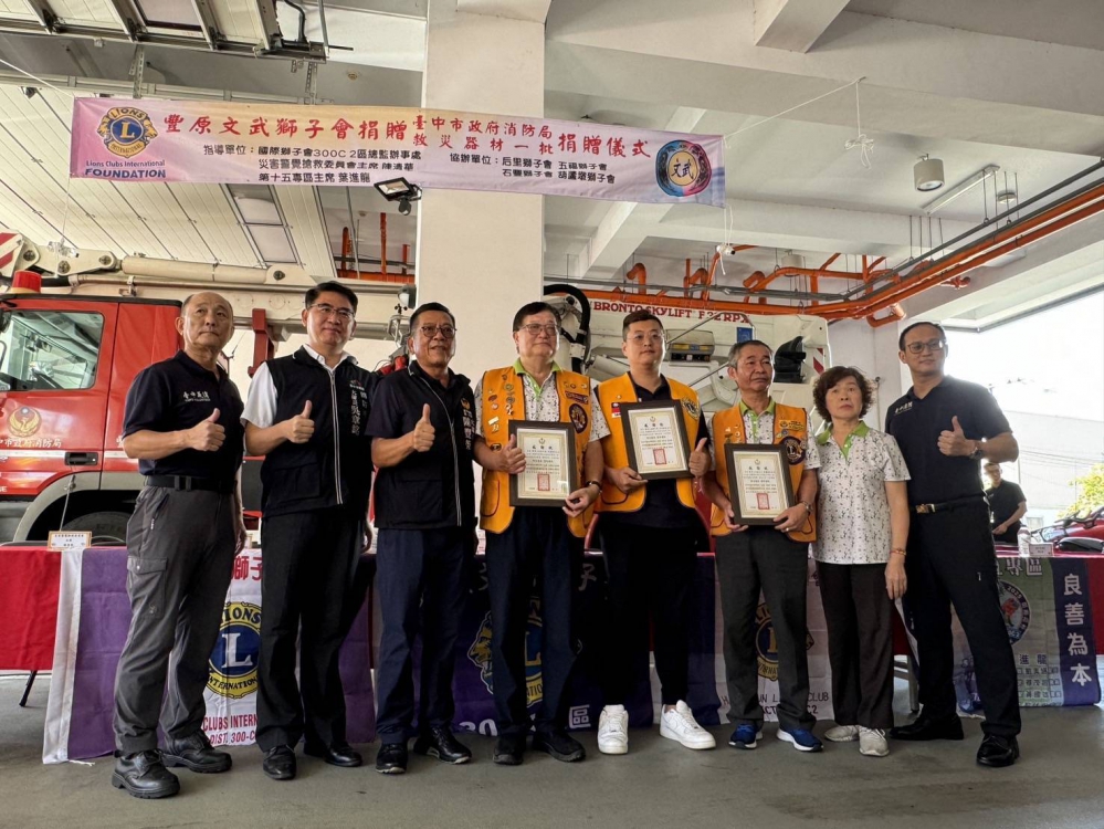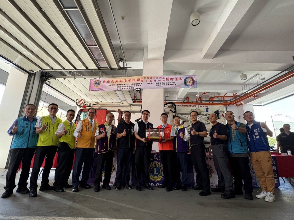 【記者林獻元台中報導】豐原文武獅子會第二十二屆會長蔡茂昌先生捐贈「移動式幫浦、半面雙罐式防毒面罩、消防救助手套、防爆頭燈、消防救災面罩」等救災裝備器材,供台中市政府消防局第一救災救護大隊豐南分隊使用,消防局25日在豐南分隊舉行捐贈典禮,感謝獅子會協助增添救災戰力。