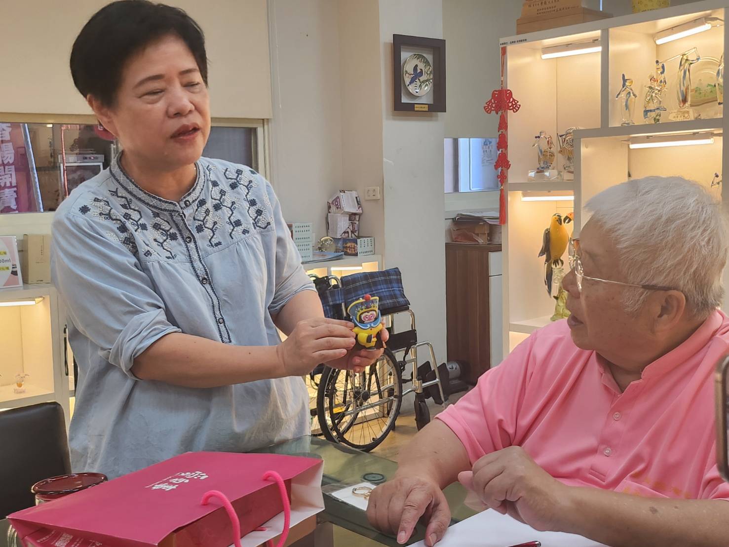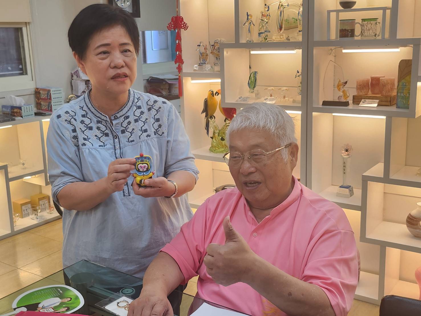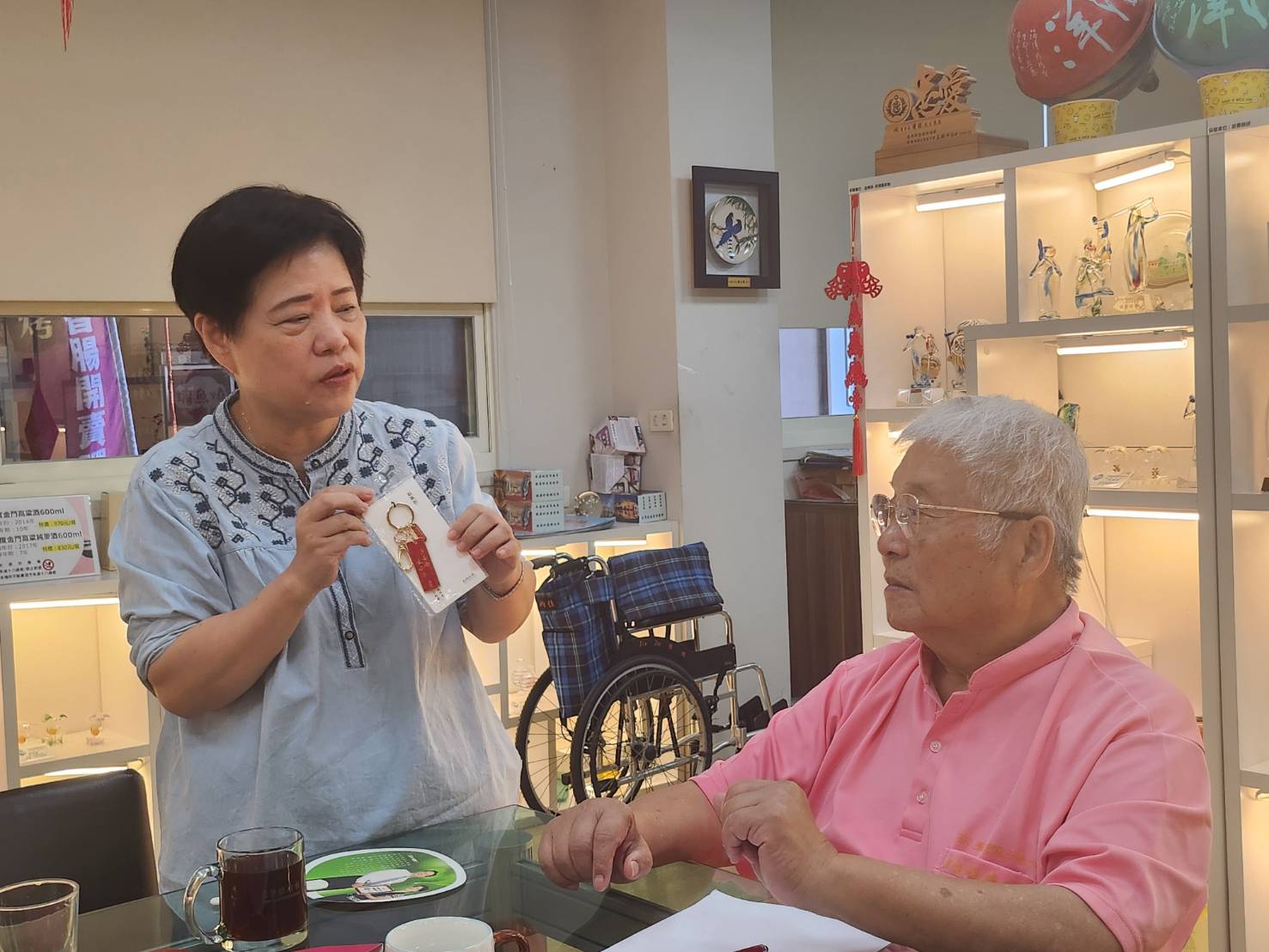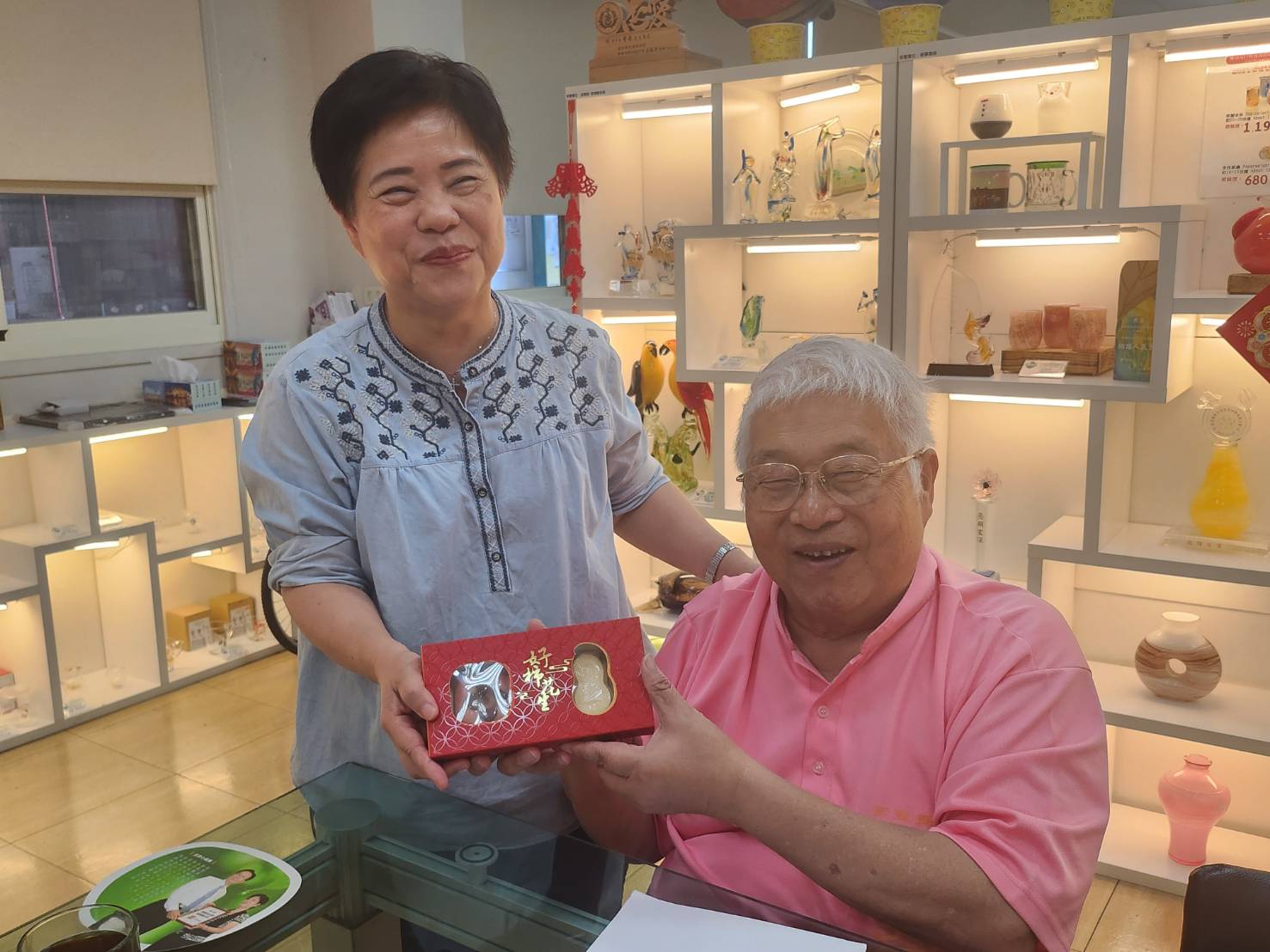 到訪的楊玉珍持3樣禮物送給林肇睢董事長,一份是手工皂打造的「花生及柿子」,寓意「好事發生」,一份是紅色底黃銅制「多喜樂常安寧」鑰匙扣祝福董事長,另一份是楊律師收藏多年具有4種變臉的「孫悟空」公仔,祝福林肇睢帶領台明將72變,無所不能,所向無敵。