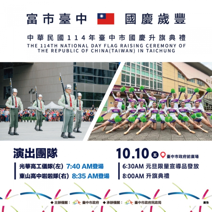 民政局補充,升旗典禮將於10月10日在台灣大道市政大樓府前廣場舉行,預計上午6時30分開始發放限量「三用照明檯燈」及小國旗,7時40分表演節目開始,升旗典禮於8時正式舉行,歡迎市民齊聚市府廣場慶雙十。不便到場的民眾,國慶當日上午7時40分也可以透過市長盧秀燕臉書粉絲專頁( https://www.facebook.com/LuShiowYen )觀看直播。
