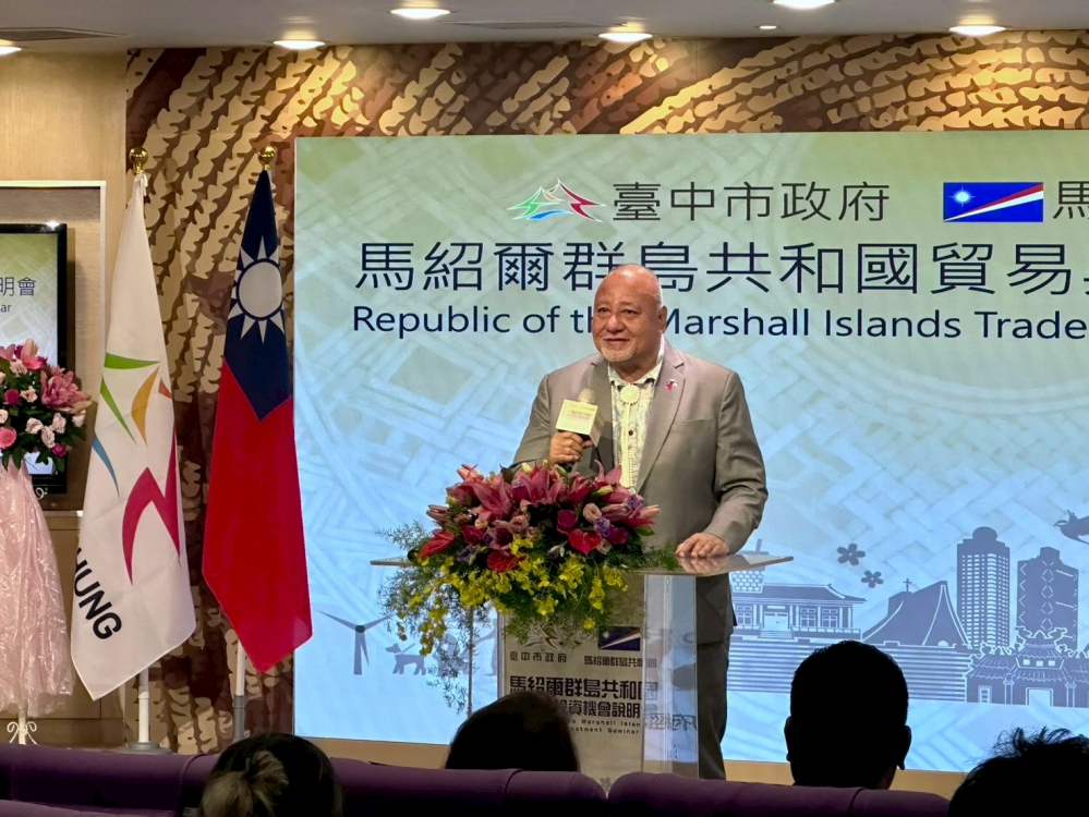 【記者林獻元台中報導】台中市政府與馬紹爾群島共和國共同主辦之「馬紹爾群島貿易與投資機會說明會」,9日上午於台中市政府台中廳舉行。馬紹爾群島自然資源暨商業部穆勒(Tony Muller)部長率領官方與產業代表訪團出席。
