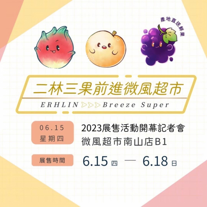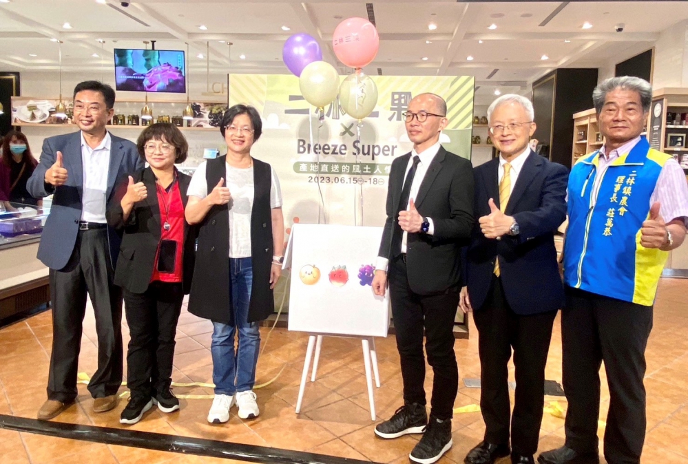 為期四天的「二林三果展售」今(15)日在微風超市南山店B1,由縣長王惠美,鎮長蔡詩傑和農會理事長莊萬恭等人揭幕,至6月18日,除二林三果外,現瑒也有彰化優鮮農特產品,王縣長邀大家品嘗二林水果和農特產品。