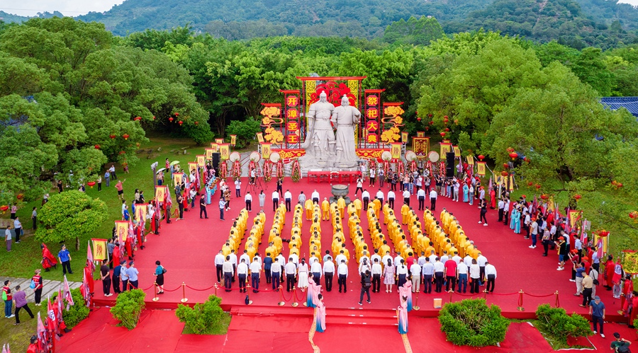 隨後,「開漳聖王」祭祀大典在將軍山公園主廣場舉行。兩岸開漳後裔代表共133人,組成主祭、陪祭、同祭,依次完成上香、獻禮等祭祀程式。在場祭拜的87姓開漳後裔達上千人,生動再現了聖王祭祀的恢宏場面。