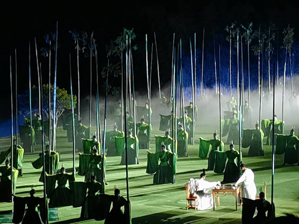 演員們伴隨著竹林舞動飛起,借喻武夷山大王峰和玉女峰的美麗傳說,以隔岸沙洲和實景山水為場景,通過投影和綵燈精彩呈現出實景電影,夢迴唐朝訴說大王和玉女的愛情故事,隔岸沙洲通過投影特效形式,可見一匹白馬賓士於山林中。