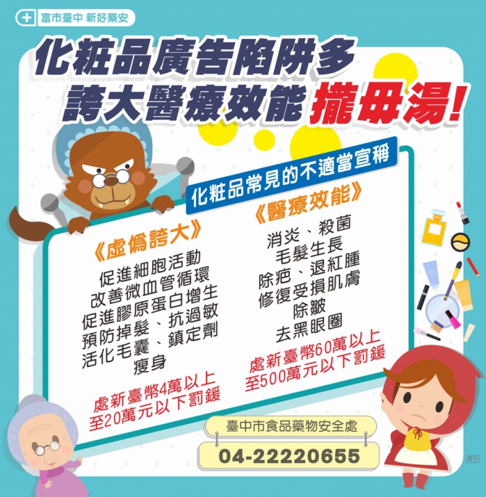 食安處呼籲,業者刊登化粧品廣告,不得涉及虛偽誇大或醫療效能,市府將持續加強查核監控各購物通路刊登的化粧品廣告,是否符合化粧品衛生安全管理法第10條規定「不得有虛偽或誇大之情事」、「不得為醫療效能之標示、宣傳或廣告」,違反者依同法第20條規定,最高可處500萬元罰鍰。