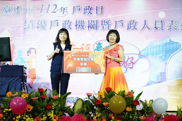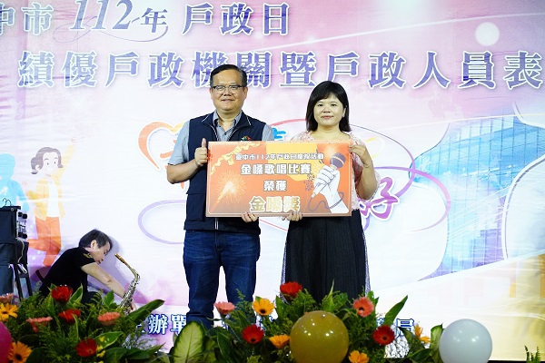 民政局副局長周瑺玫則頒發台中市111年度9所績優戶政業務評鑑特優機關及28位績優戶政人員。另為舒緩同仁平日工作壓力,慶祝活動並規劃戶政金嗓獎歌唱比賽,除展示戶政人員個人才華和風采外,並藉此增進同仁情感,凝聚團隊向心力。