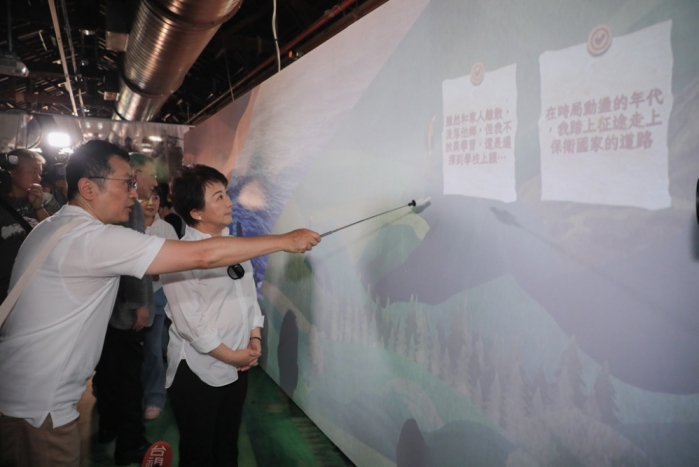 基金會秘書長石靜文帶領記者會貴賓介紹展場,她說「我家的兩岸故事」巡展以新科技讓民眾了解歷史,展覽的第一區域還原了遷臺人物漂流的第一站「跨越黑水溝」,現場以大型船艙造景與三面投影,營造浪濤中橫渡海峽的不安環境及心境,觀眾可沉浸式體驗戰亂中倉皇離家、迢遙渡海的顛沛氛圍。