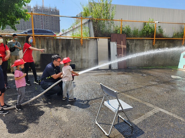 現場20位小朋友穿上小小消防員服裝,體驗手持消防瞄子射水、斜降等,讓孩子們對消防工作的認識和尊重,小朋友也問紅色消防車很巨大,趕路滅火很神勇,爸爸說遇見消防車和救護車及警車均要靠邊,讓先行。