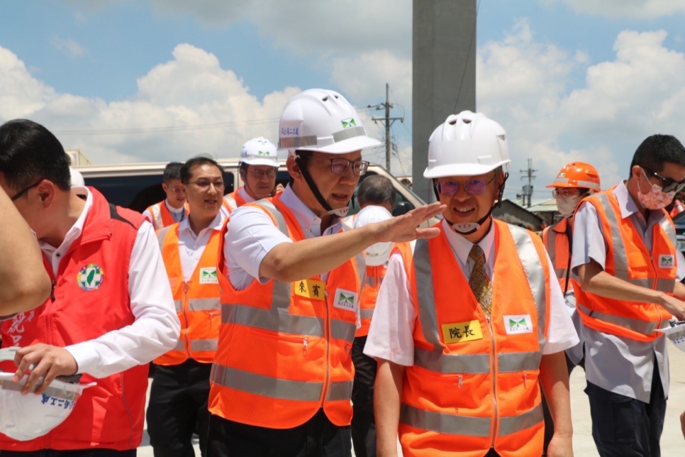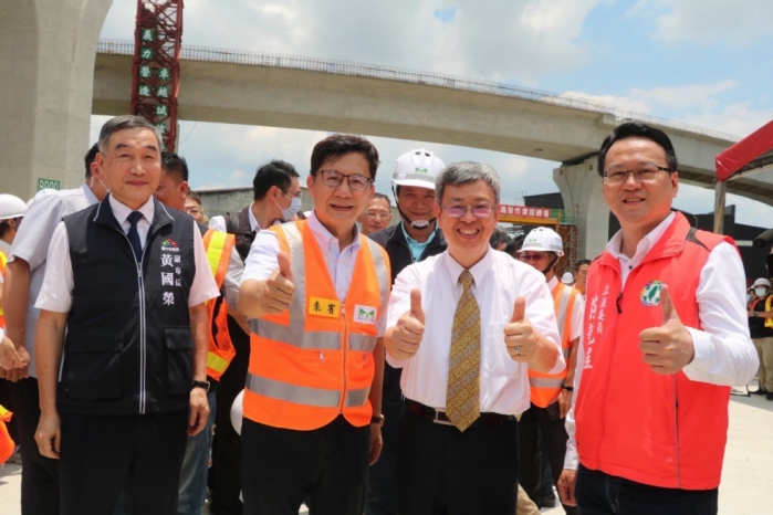 【記者林獻元台中報導】行政院院長陳建仁10日在交通部長王國材、台中市副巿長黃國榮及立委張廖萬堅等人陪同下,視察國道一號增設銜接台74線系統交流道工程。陳建仁致詞時特別感謝交通部及工程人員在動工後不久即遇到疫情爆發,迄今進度仍能小幅超前,也特別感謝立委張廖萬堅從爭取計畫核定到經費核定、工程發包,多次協調協助工程進度,現今工程進度逾72%,明年五月完成通車後,對緩解中清交流道及週邊道路的車潮很大的幫助。