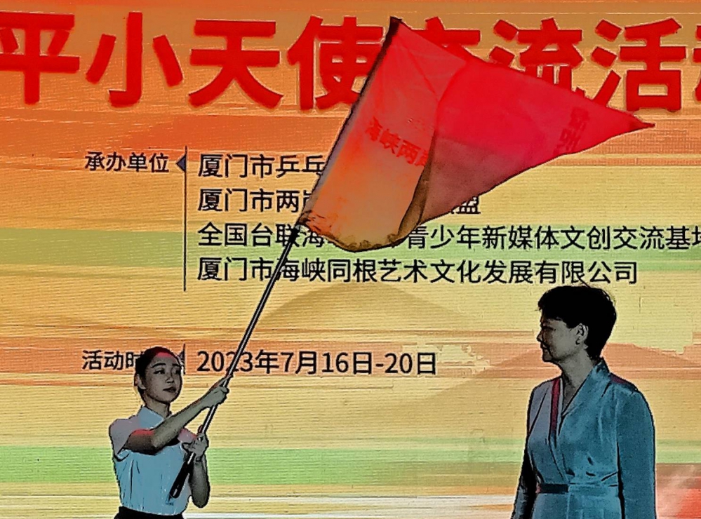 由於海峽兩岸和平小天使交流活動,於16日才開始,因此在會中舉行和平小天使研學營開營儀式,由廈門市海外聯誼會長王雪敏授旗給和平小天使代表。