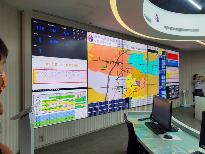 參訪第三站於該公司一樓參觀行管中心,由管制科丁羅科長說明行管中心內各項監控資訊系統及其功能,24小時全程監控整壓站管壓輸氣狀況,如有管壓過高即會緊急遮斷停止供氣,啟動緊急異常應變並通報專人處理,確保供氣安全;也可即時監控道路施工不慎挖損天然氣管線時應變工作;並說明行管中心轉換成防災應變中心的時機及流程。