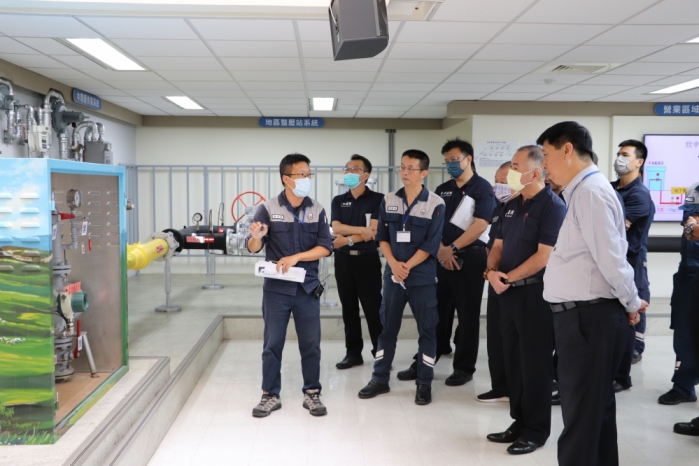 參訪第二站則參觀該公司員工教育訓練場,由工務部蔡經理說明由中油供應天然氣端至輸送到用戶端的整個輸氣過程及相關監控安全系統功能及設備維護保養作為,現場消防局參訪人員提出多項問題,養護部周經理當場詳細解答,充分達到雙方交流效果。