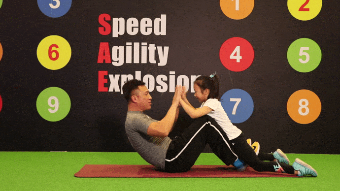 2、卷腹擊掌:大人呈躺姿,雙腳屈膝,讓小朋友的上半身趴在大人的小腿上。吸氣預備,吐氣時使用腹部核心力量卷起上半身,舉起雙手與孩子擊掌,再慢慢回到起始位置。