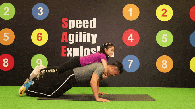 3負重伏地挺身:大人採跪姿伏地挺身姿勢,手腕在肩膀的正下方,讓小朋友趴在背上,雙手環住大人頸部。吸氣時手肘彎曲,向下讓胸部接近地面;吐氣慢慢用力推起,重複動作。