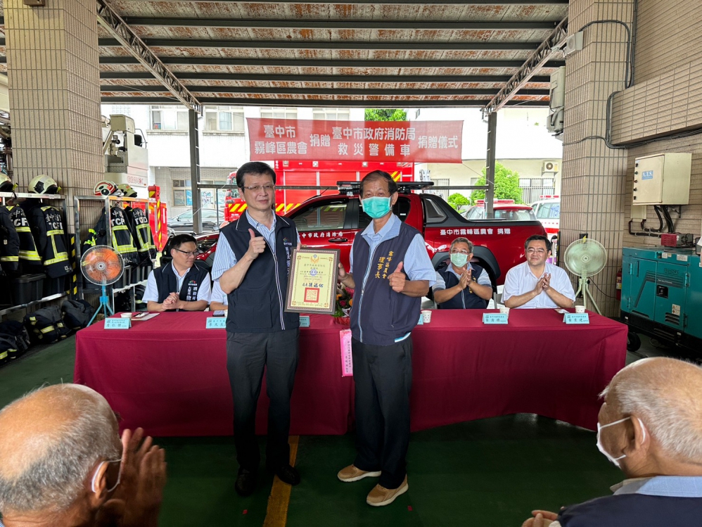 【記者林重鎣台中報導】提升台中市霧峰地區消防救災量能,造福鄉親回饋社會!台中市霧峰區農會捐贈台中市政府消防局四輪驅動皮卡做為災害搶救消防警備車用,24日舉行捐贈儀式,由消防局副局長楊元吉接受捐贈並頒發感謝狀。楊元吉表示,將充分利用這項資源來提升消防救災的應對能力,為霧峰鄉親帶來更安全更幸福的生活。