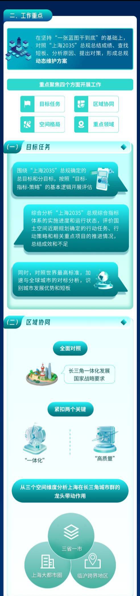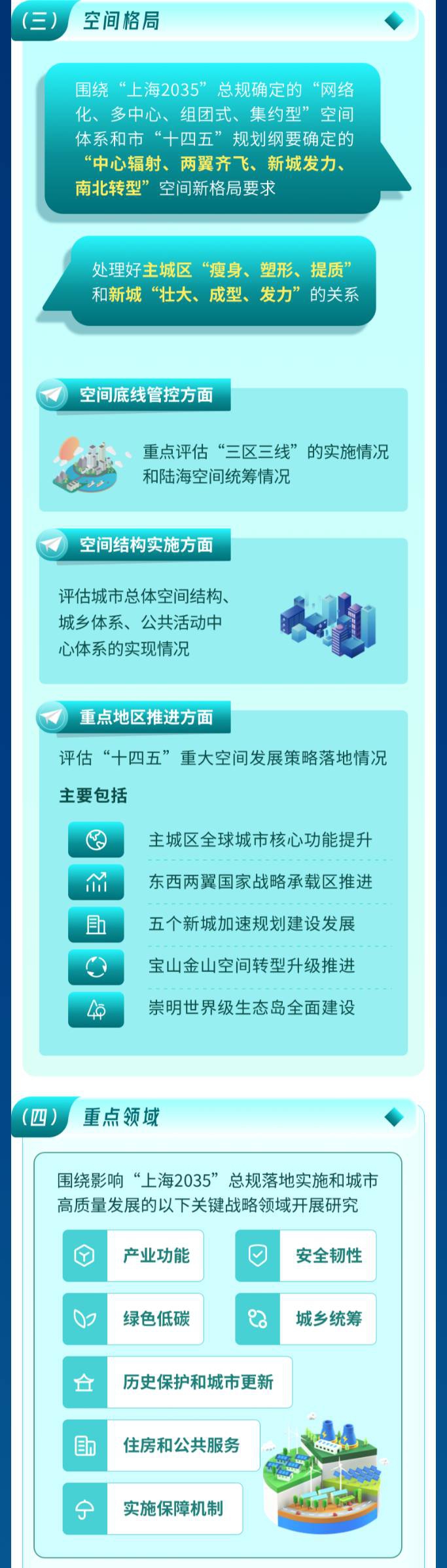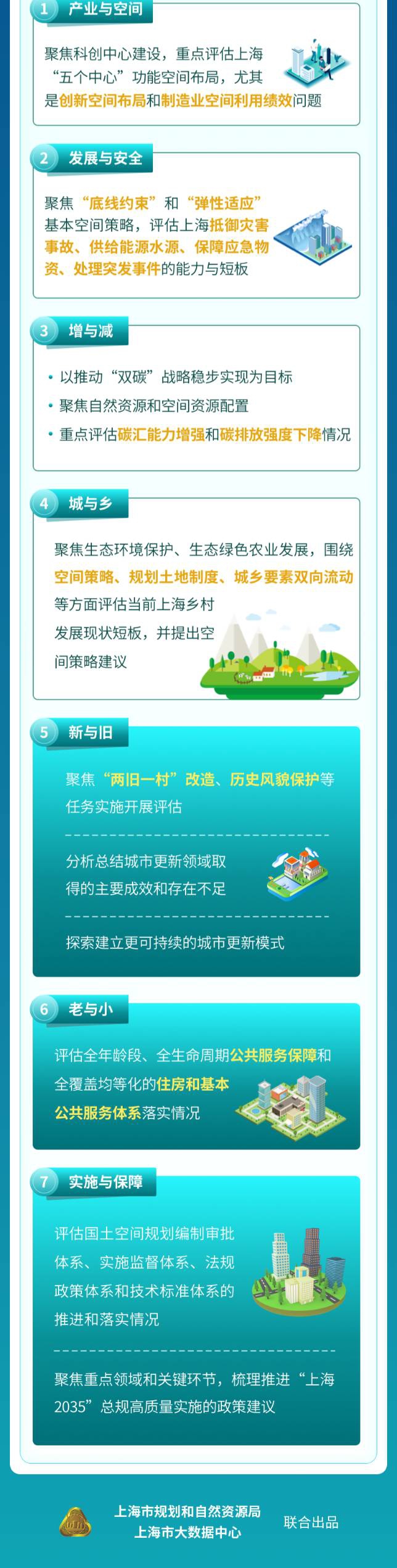 二、評估對象和時點:主要評估「上海2035」總規實施情況,同步評估《上海市國土空間近期規劃(2021-2025年)》、各有關區總體規劃暨土地利用總體規劃、主城區單元規劃、市級各專項規劃的實施情況。