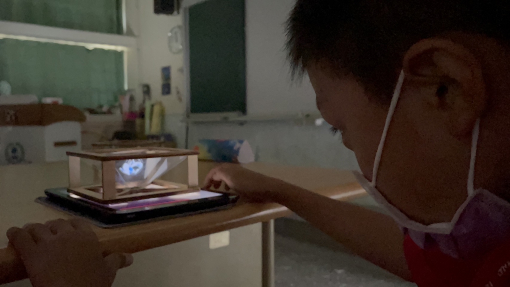賴主任說,營隊課程模擬星空劇場,讓學生體驗觀看太空星雲及恆星變化及古人看天空,將星星連起來,變成不同星座,透過虛實合一的3D全息投影科技,讓學生了解現在生活有多少已經被3D影像取代,進而學習到"干涉與繞射"及"物體反射或透射光線"各種科學原理。
