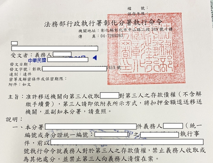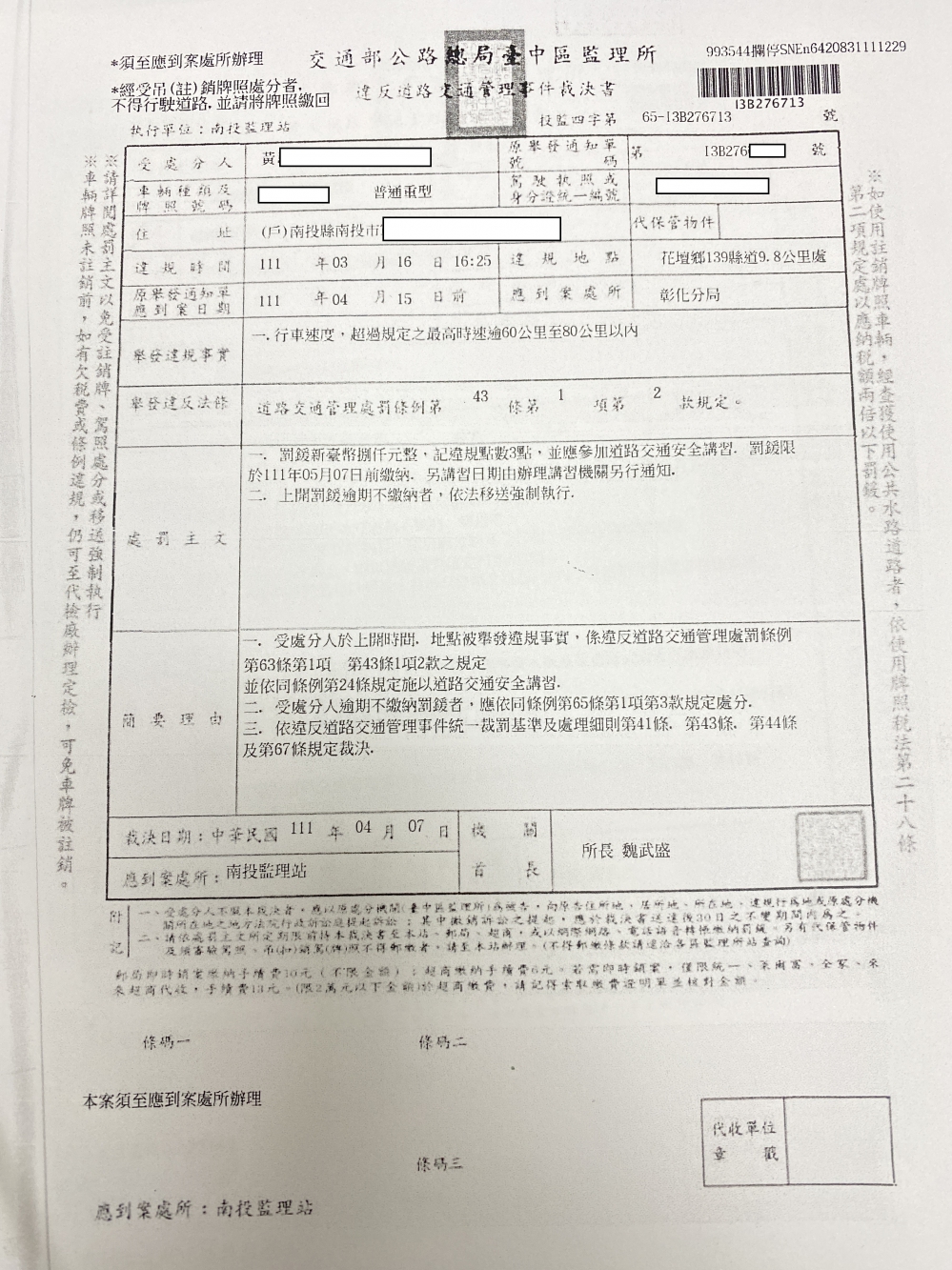 分署說,南投市黃姓男子(92年次),在駕照吊扣期間的111年3月16日,在139縣道9.8公里處,以逾60公里至80公里的超規定速度駕重型機車時遭員警開單舉發,由中區監理所裁罰1萬4000元,因逾期未繳被移送分署執行。