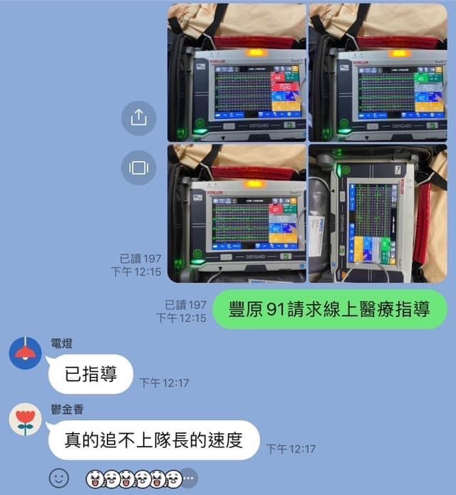消防局描述,7月15日中午,豐原分隊接獲消防局救災救護指揮中心派遣急病救護案件,救護同仁出勤途中,派遣員持續更新患者最新病情,表示患者剛做完腹膜透析且目前意識不清,一到場便以完整的高階救護裝備進行評估。