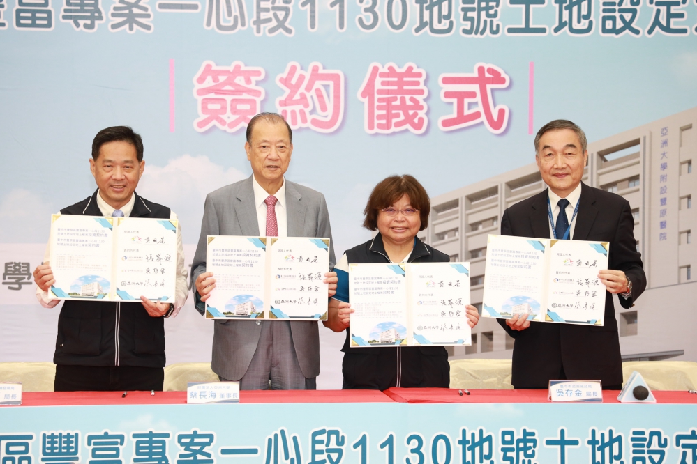 【記者林獻元台中報導】台中市豐原區豐富專案一心段1130地號土地設定地上權案,2日在副市長黃國榮見證下,由市府經發局長張峯源、地政局長吳存金與財團法人亞洲大學及中國醫藥大學董事長蔡長海,三方隆重完成簽約儀式,由亞洲大學投入55億元興建「亞洲大學豐富健康產業園區」,提供山城地區醫療、長照與托育等全齡照護,預計2028年完工。