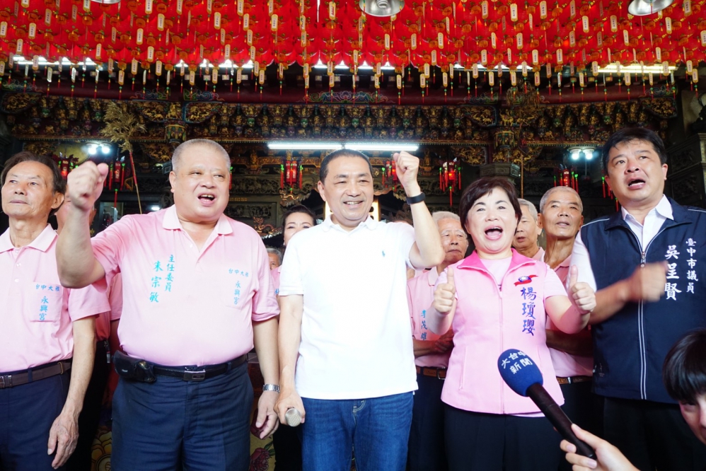 侯友宜11日南下參拜宮廟,一早首站來到大雅永興宮,主委朱宗敏率全體委員及信眾歡迎,並稱讚市長任內政績卓著,各項評比名列前茅,獲得國民黨推薦參選總統,呼籲各界全力支持,也祈求天上聖母庇佑侯市長政躬康泰、心想事成。