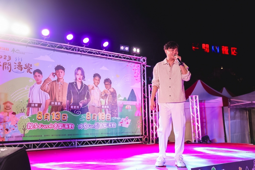 【記者林獻元台中報導】 參山處主辦谷關湯饗溫泉季,18日晚上在谷關台電會館前廣場舉辦「仲夏FUN鬆音樂派對」,大雨中熱情不減,吸引數百名歌迷到場嗨翻谷關,聽歌兼泡湯。演場會由歌聲穿透力實足的邱軍、華語男團「黑旋風」輪番上陣,小歌迷拿led看牌站在台前力挺,台語歌王許富凱的深情演唱,吸引粉絲從各縣市追逐而來,而鐵肺天后戴愛玲幾首經典歌曲,讓觀眾擠在台前一起熱舞,將氣氛帶到最高潮。