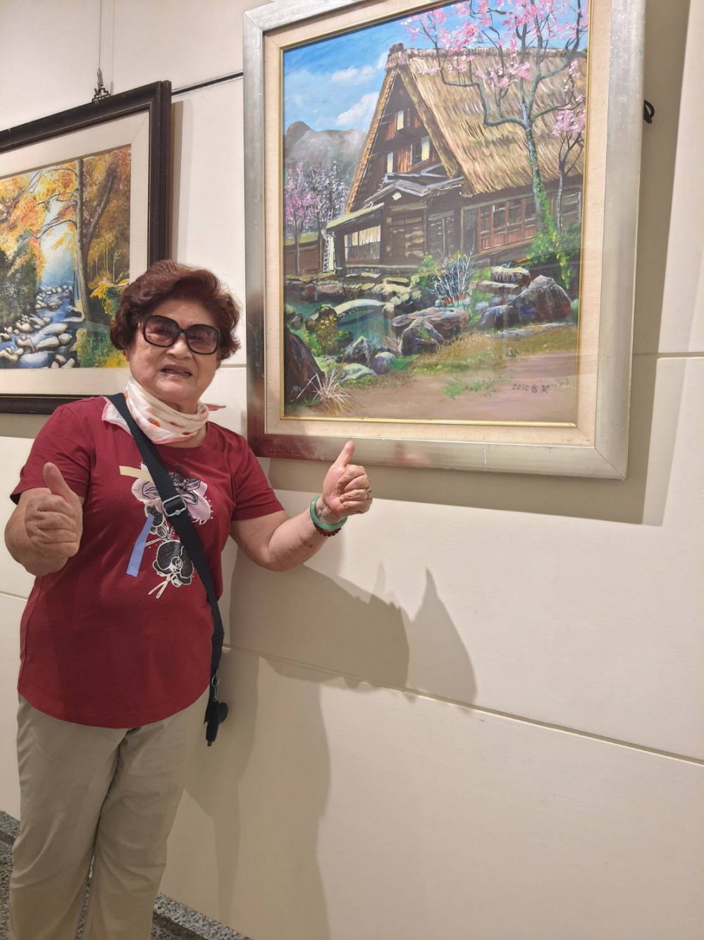 〔記者周為政永靖報導〕大葉大學長青繪畫班10餘位不老﹁藝童﹂,聯合在永靖鄉成美藝廊舉辦畫展,其中之一的國小退休教師張含笑,雖然已83歲高齡,但仍耳聰目明,藝術涵養超好,她的一幅宛如童話故事的日本黑部立山﹁合掌村獨特造型木屋﹂寫實畫作,不論取景、畫工、顏色,堪稱一流,看過者無不嘖嘖稱奇。