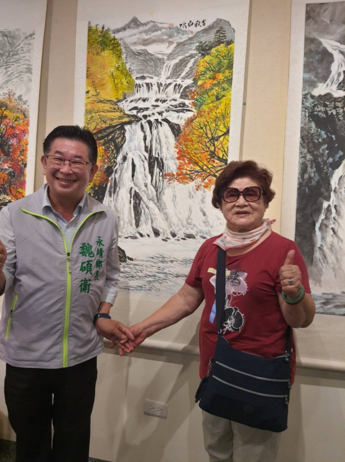 參與開幕儀式的來賓大爆滿,各行各業都有,大葉大學部份,除易映光老師外,還有對繪畫有高度素養的育成中心主任吳建一博士,政界部份有立委陳素月、永靖鄉長魏碩衛、祕書蕭富元、縣議員曹嘉豪、埔心鄉代陳素蘭、員林代表會主席張國良、代表張偉傑,最難得的是享譽全台的和和音樂操創始人施福珍、周玉葉夫妻,兩人不但全程參與,更號召10多名隊員力挺,周老師說,畫友之一的張含笑,是她小女兒施孟玟的婆婆,算是她的親家母,親家母開畫展,是莫大的榮耀,她和老伴(施老師)一定要來捧場。