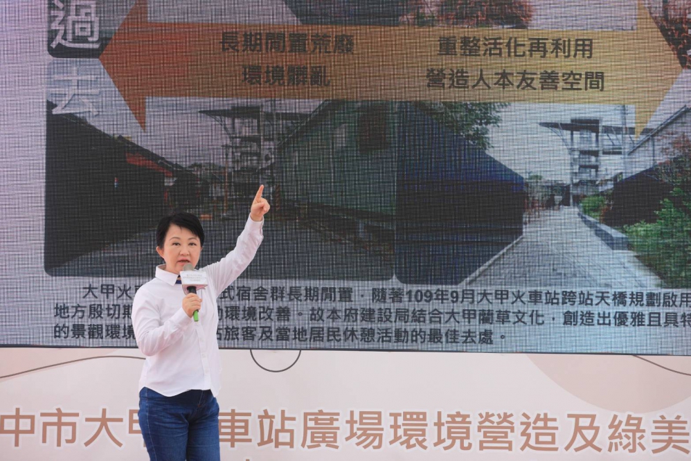 【記者陳榮昌大甲報導】台中市大甲火車站屬大甲、大安、外埔重要交通節點,台中市政府籌編約4100萬元工程經費,改善大甲火車站南側站前廣場及鄰近日式宿舍周邊環境營造工程,今年7月底已完工,23日舉辦完工啟用典禮,市長盧秀燕出席表示,她十分重視此項工程,特別從其二備金撥用4100萬經費,結合在地特色打造車站為「藺草道」,回應地方期待。