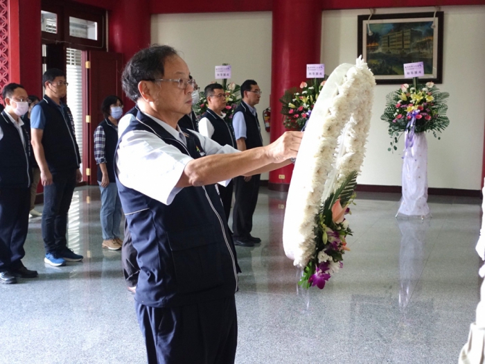 【記者林獻元台中報導】台中市生命禮儀管理處,23日在台中市軍人忠靈祠舉行「112年度國軍陣(公)亡官兵秋祭典禮」,由市府民政局長吳世瑋代表市長盧秀燕擔任主祭官,帶領各界與會代表及烈士遺族家屬,向國軍忠烈將士靈位上香、獻花致祭,並由司儀恭讀祭文,全體人員最後向靈位行三鞠躬禮,表達對烈士忠魂的尊崇與無盡哀思,典禮莊嚴肅穆。