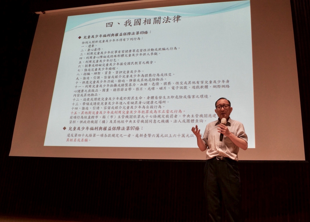 課程中,高玉泉教授從「人權」的觀念談起,介紹聯合國自成立以來的相關宣言及公約,進一步切入兒童權利保障,從兒童權利公約精神及理念,談到一般性原則、兒童最佳利益及不當對待的規定,並以新北市、台中市實際發生的案例分享,深入淺出的介紹我國現行法律對於兒童權益的保障。
