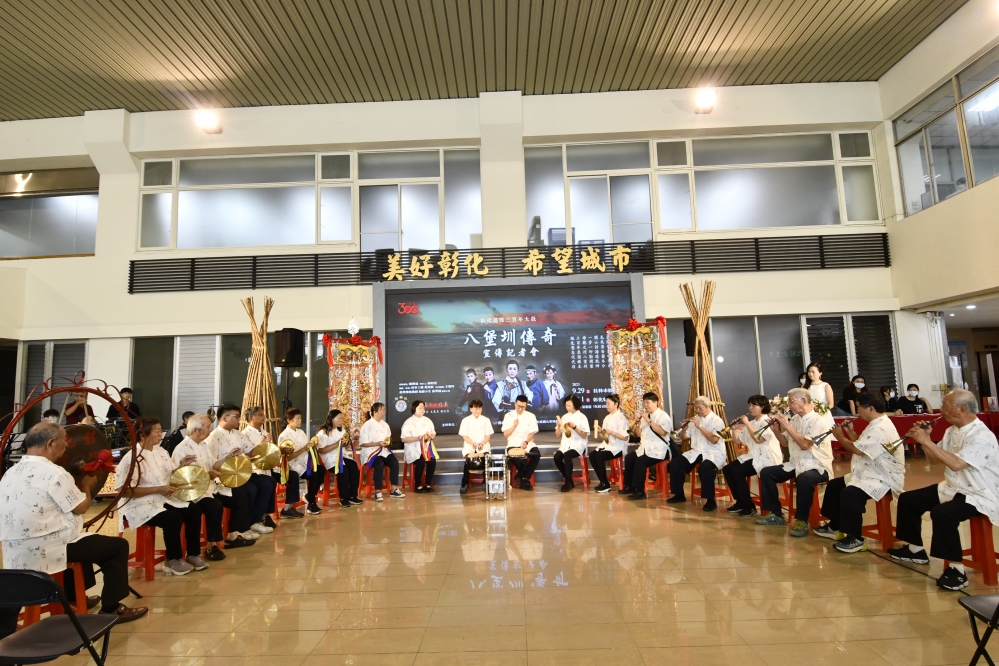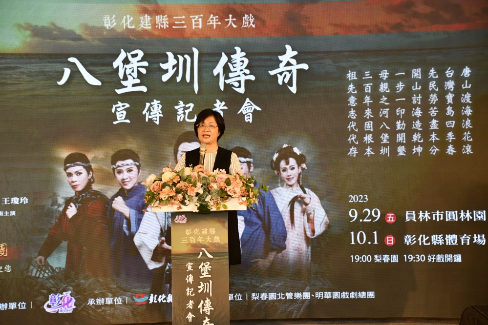 彰化在地的文化寶藏「梨春園」北管樂團,擔任今日開場表演,王縣長說,「八堡圳傳奇」將於9月29日晚上7點半在圓林園演出,10月1日晚上7點半在縣立體育場公演,演出前由「梨春園」暖場,「八堡圳傳奇」由團長陳勝福任藝術總監、陳昭賢執行長製作、孫翠鳳領銜主演、知名編導黃致凱、文學小說家王瓊玲共同編劇,出動300位演員演出。
