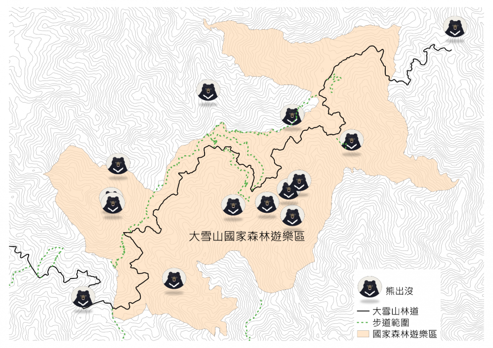 林業保育署臺中分署說明,該分署在大雪山國家森林遊樂區及周邊山域,長期架設紅外線自動相機進行中大型哺乳動物監測,在所架設的18台自動相機中,就有13台相機曾記錄到黑熊身影,稱為有熊森林當之無愧。
