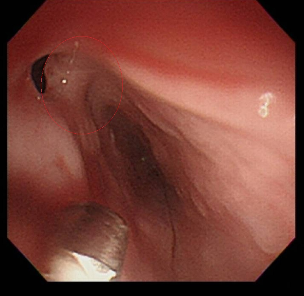 ▲內視鏡下的食道腫瘤(紅圈處)。(彰化醫院提供)