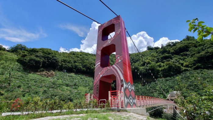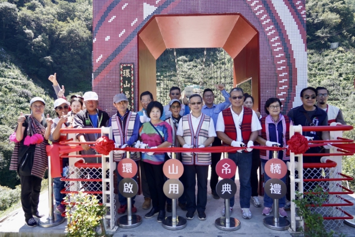 建設局說明,新建吊橋參採橋址周邊意象及地方意見,命名為「環山吊橋」;橋塔彩繪塗裝融入當地環山部落泰雅族圖騰元素,色彩意象運用部落女性常用菱形變化織紋,意寓「祖靈環抱」,守護每位農民安全。