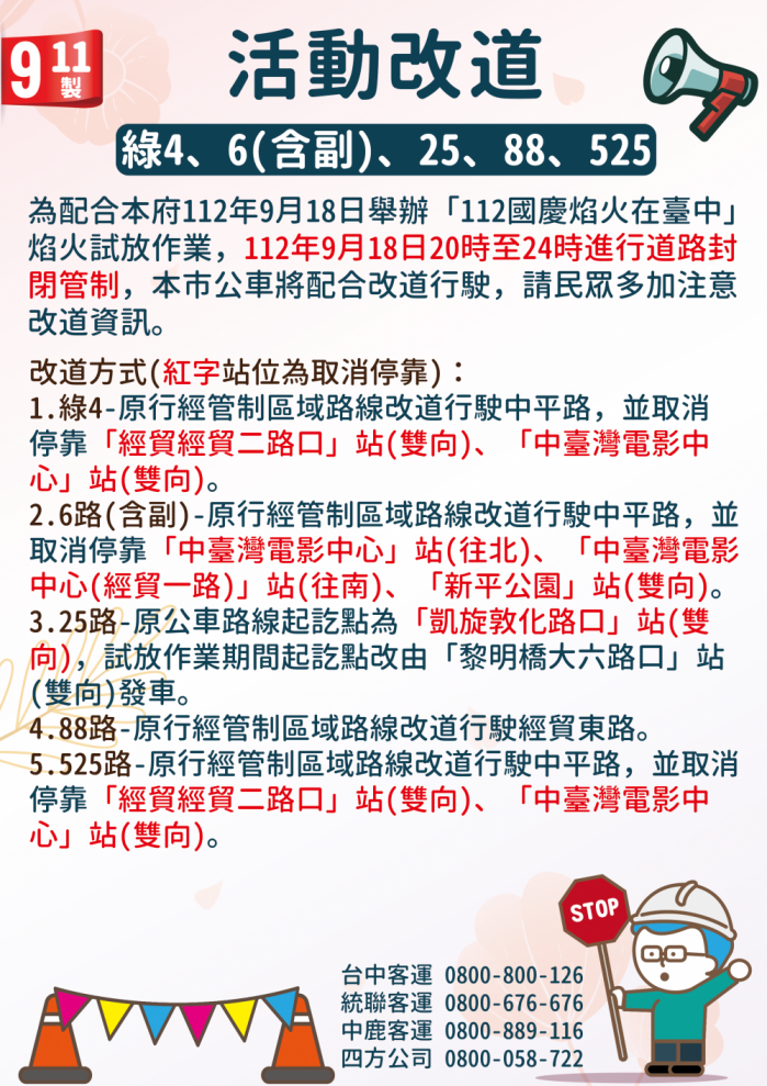 交通局提醒,配合國慶焰火試放,部分公車及iBike站點將進行管制,其中市公車路線6、6副、25、88、525、綠4配合交通管制路段將進行改道,詳情可至台中市公車動態資訊網頁 及台中公車APP ( https://citybus.taichung.gov.tw/