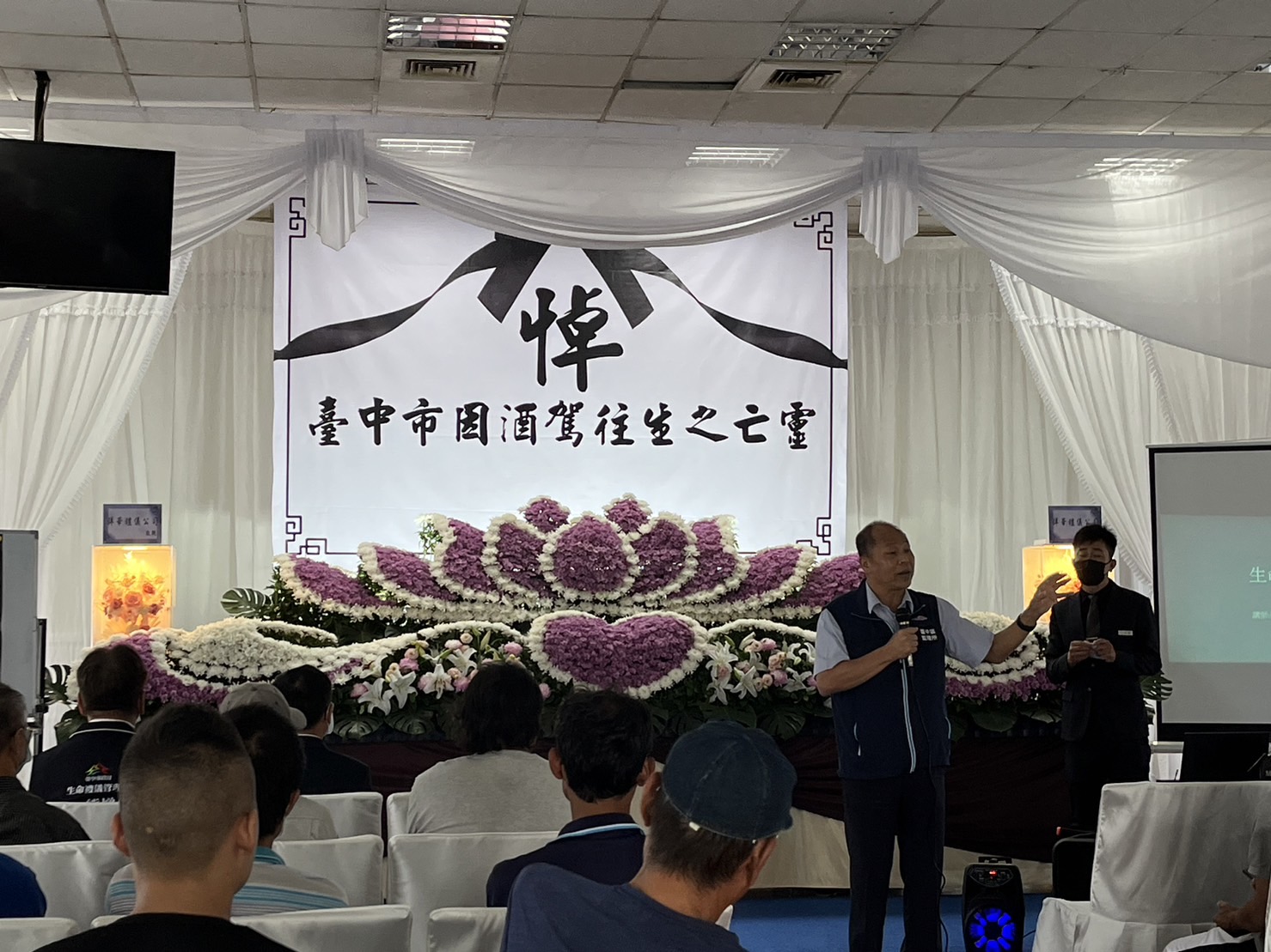 【記者林明佑/台中報導】今天是農曆七月最後一天,為了讓酒駕累犯體驗與死亡最近的距離,交通部公路總局台中區監理所與台中市政府交通局、台中市生命禮儀管理處合作,將「酒駕累犯道安講習」移師到崇德殯儀館,針對31名酒駕累犯辦理別具意義的生命禮儀課程,現場特別將上課教室布置成告別式會場,希望透過震撼教育,讓參與課程的酒駕累犯者在靈堂體會生命無價,對酒駕害人害己的嚴重後果有所警惕。