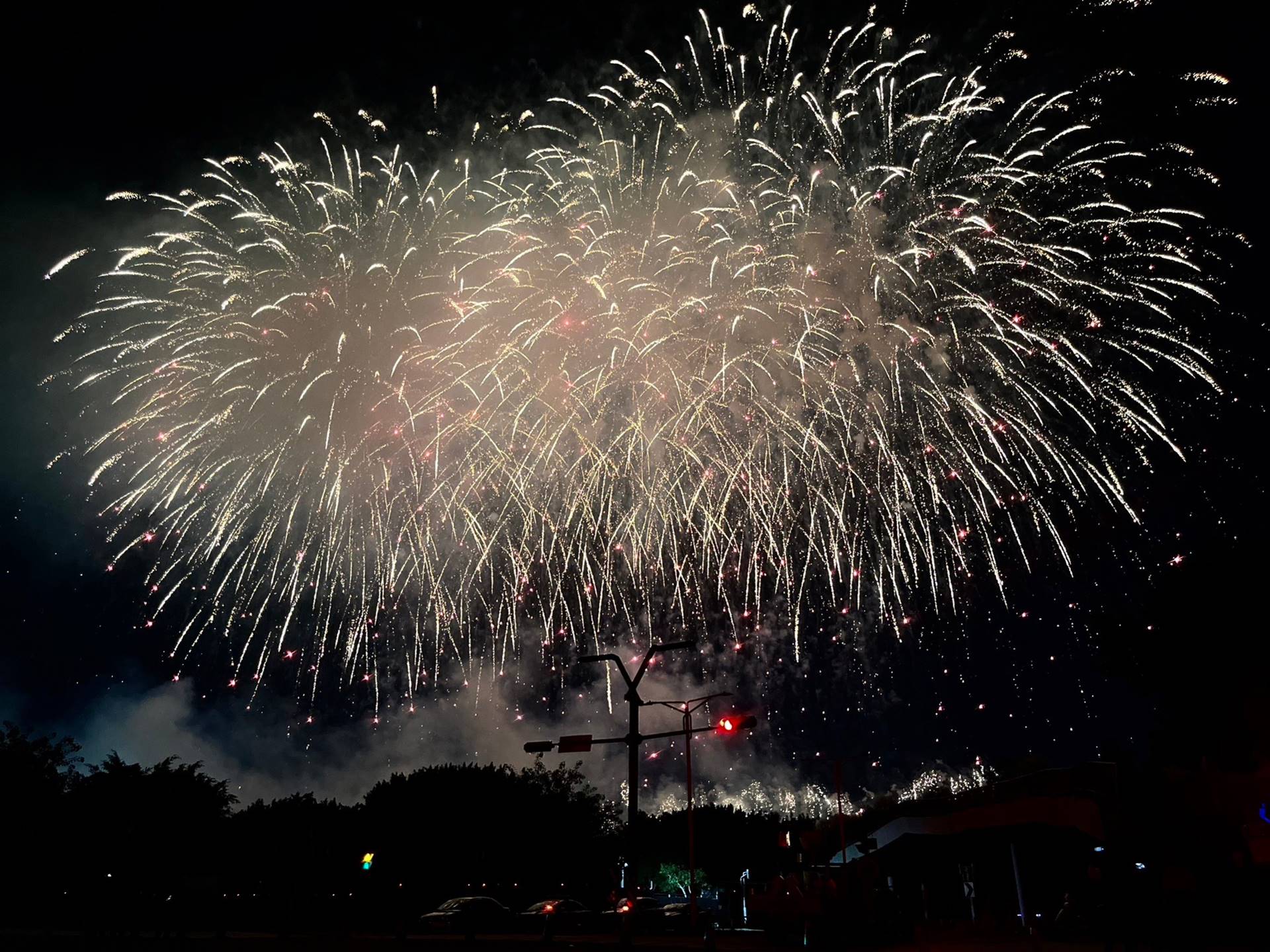 ▲現場有3吋至6吋不等逾1500發焰火彈,結合單排盆花、單發焰火及各式組合等不同花樣,在地貌寬闊的中央公園上空精彩綻放。(台中市政府民政局提供)