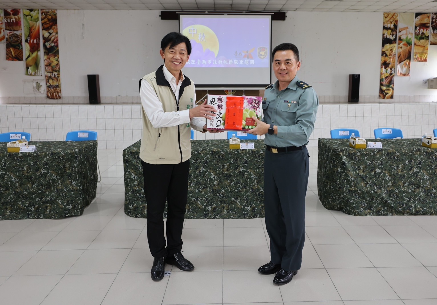 活動除陸軍第八軍團外,還有空軍第一戰術戰鬥機聯隊、三九化學兵群、陸軍第五四工兵群、臺南市後備指揮部、空軍防空暨飛彈七九四旅、陸軍第四地區支援指揮部台南聯保廠、陸軍第五地區支援指揮部嘉義聯保廠、海巡署偵防分署台南查緝隊、海巡署偵防分署北門查緝隊、海巡署南部分署第11岸巡隊等共11個單位參與,副市長代表致贈慰勞金及農特產品給部隊,另送在場本市籍子弟每人1份伴手禮,祝福官士兵們中秋佳節愉快。