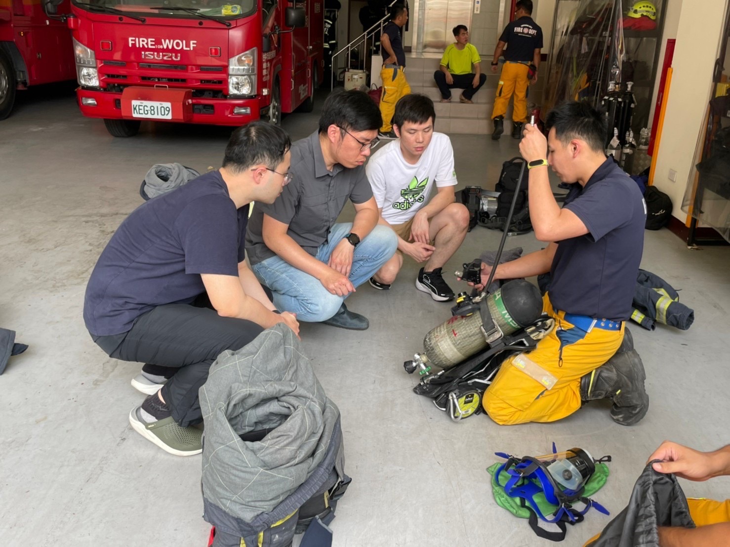 ▲消防衣著裝及空氣呼吸器介紹與實做。(台中市政府消防局提供)