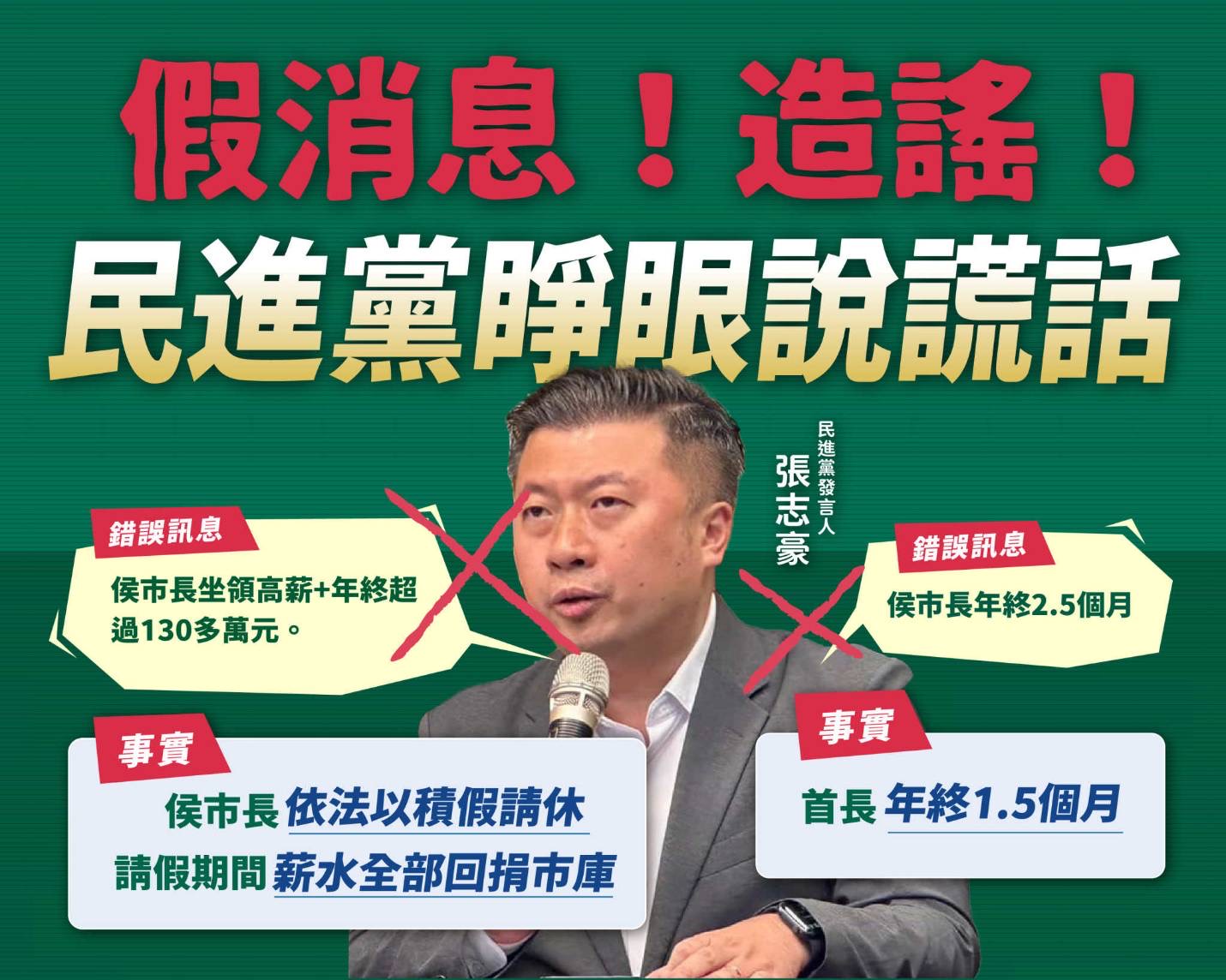 新北市政府再度重申,侯友宜市長根據《行政中立法》、《公務人員請假規則》依法以尚未使用的積假辦理休假,依照民進黨以今年9月23日至明年1月13日計算的區間來看共77個工作天,何來該黨發言人口中的113天?市府團隊全力推展各項市政建設毫不懈怠,市政工作持續運轉推進。市府也清楚說明,侯市長請假期間薪資全部回捐市庫,無奈民進黨視而不見,一再透過黨中央發言人、黨籍民代充當側翼,刻意魚目混珠形塑成請假113天超越百日的假象,連首長1.5個月的年終數字,都可以捏造成2.5個月,一再用誇大不實的言詞, 製造假消息誤導大眾,離譜至極。