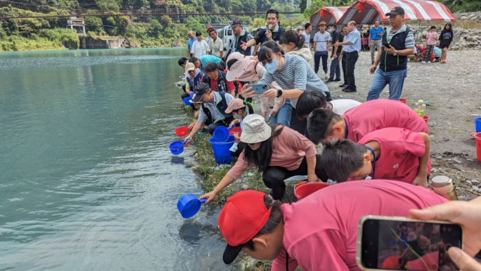 今年魚苗放流活動27日上午10時由劉演鎮廠長偕同電廠工作人員、古秀英市議員服務處黃永光特助、和平區民代表楊淑青副主席、蕭友祥代表、林吉財代表、和平區公所、里長、在地白冷國小、德芙蘭國小及和平國中師生等近百人於馬鞍壩左岸進行魚苗放流,期許孩子們藉由親手送小小魚苗回家。